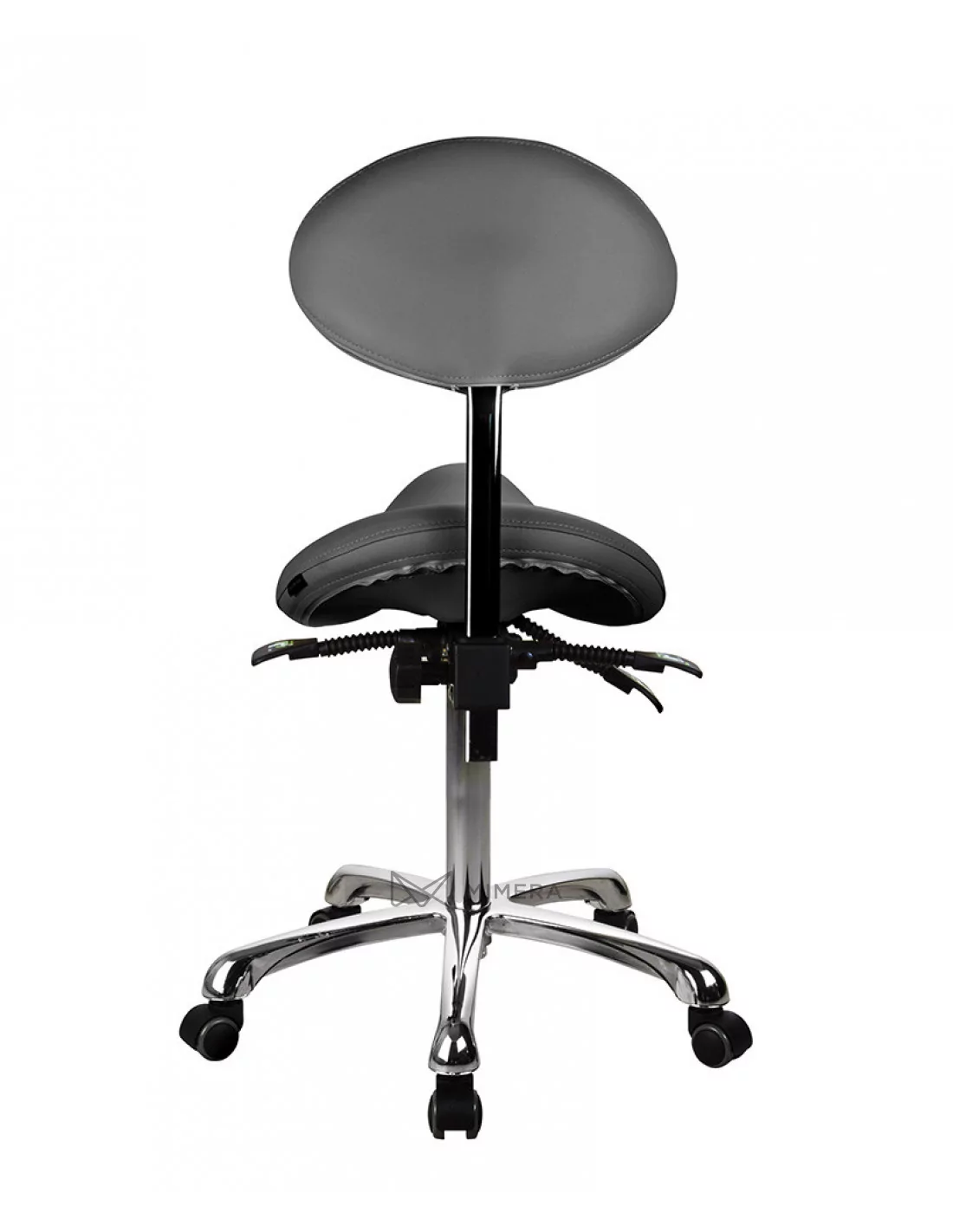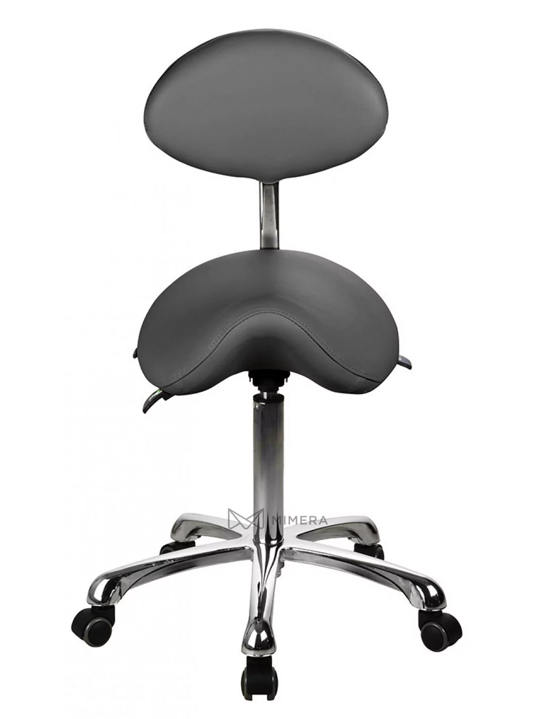 Ein bequemer, ergonomischer Stuhl mit Rückenlehne und profiliertem Sattelsitz sorgt für maximalen Arbeitskomfort. Die Sitzung auf einem Sattelstuhl unterstützt eine aufrechte Haltung, die Muskelverspannungen und Rückenschmerzen reduziert. Die Höhe, Neigung des Sitzes und der Rückenlehne kann kontinuierlich durch drei Handhebeln, die sich unter dem Sitz befinden, geregelt werden. Die hochwertige PU-Polsterung ist leicht zu reinigen und die Chrombasis ist mit fünf Rädern ausgestattet, die Ihnen für Sie die bequeme Arbeitsposition zu finden erleichtert. Der Stuhl hat vielseitige Verwendung an verschiedenen Arbeitsplätzen wie in den Laboratorien, Gesundheits- und Schönheitssalons.