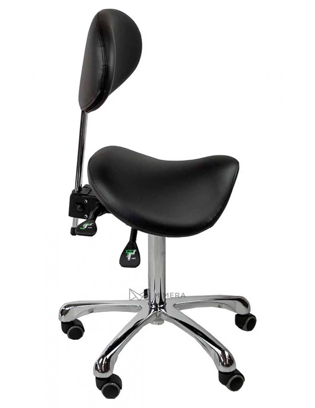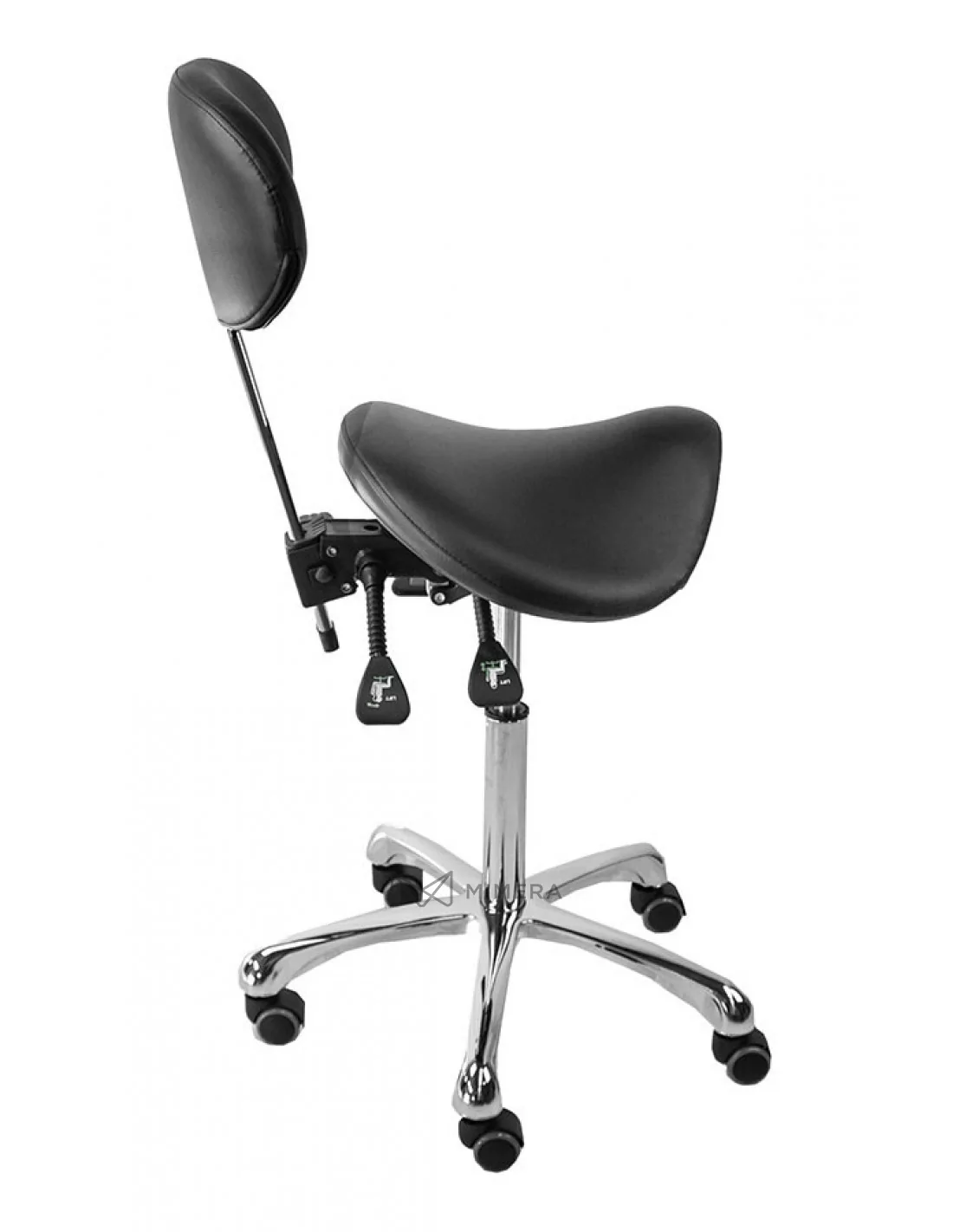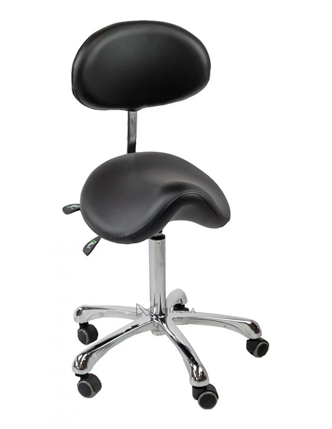 Ein bequemer, ergonomischer Stuhl mit Rückenlehne und profiliertem Sattelsitz sorgt für maximalen Arbeitskomfort. Die Sitzung auf einem Sattelstuhl unterstützt eine aufrechte Haltung, die Muskelverspannungen und Rückenschmerzen reduziert. Die Höhe, Neigung des Sitzes und der Rückenlehne kann kontinuierlich durch drei Handhebeln, die sich unter dem Sitz befinden, geregelt werden. Die hochwertige PU-Polsterung ist leicht zu reinigen und die Chrombasis ist mit fünf Rädern ausgestattet, die Ihnen für Sie die bequeme Arbeitsposition zu finden erleichtert. Der Stuhl hat vielseitige Verwendung an verschiedenen Arbeitsplätzen wie in den Laboratorien, Gesundheits- und Schönheitssalons.