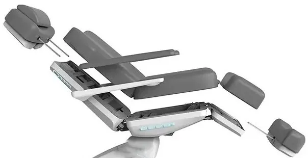 Die Liege ist mit einer verstellbaren Kopfstütze, einem abnehmbaren Kopfkissen und einer Gesichtsöffnung (FACECUT) ausgestattet, was eine vielseitige Nutzung für unterschiedliche Behandlungen ermöglicht.