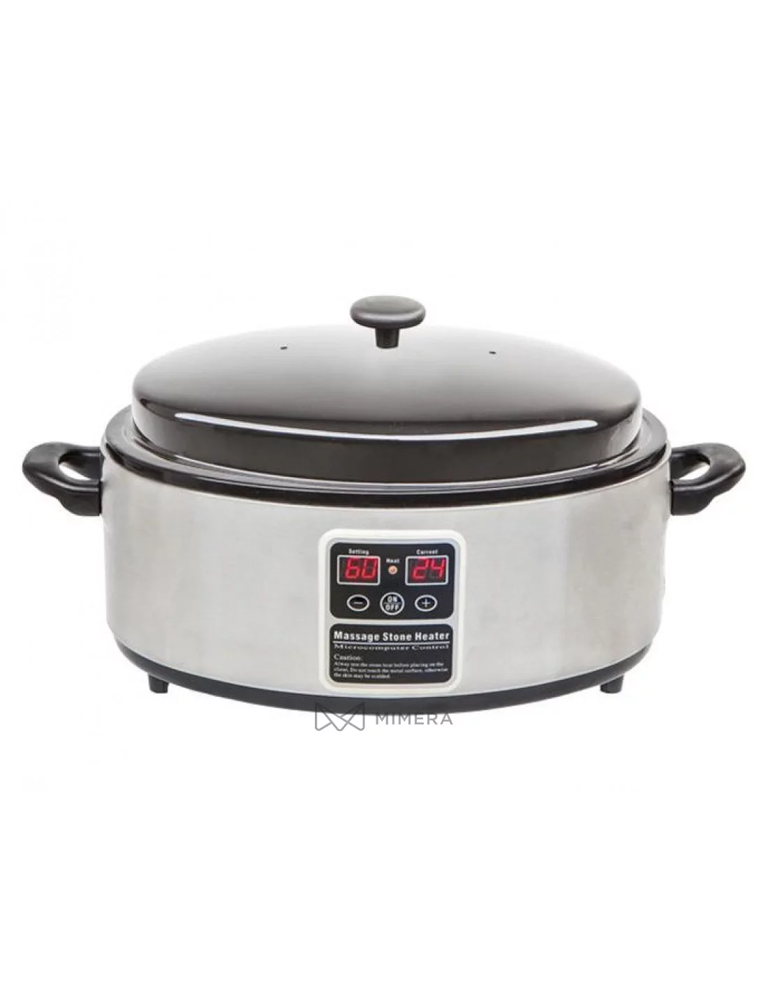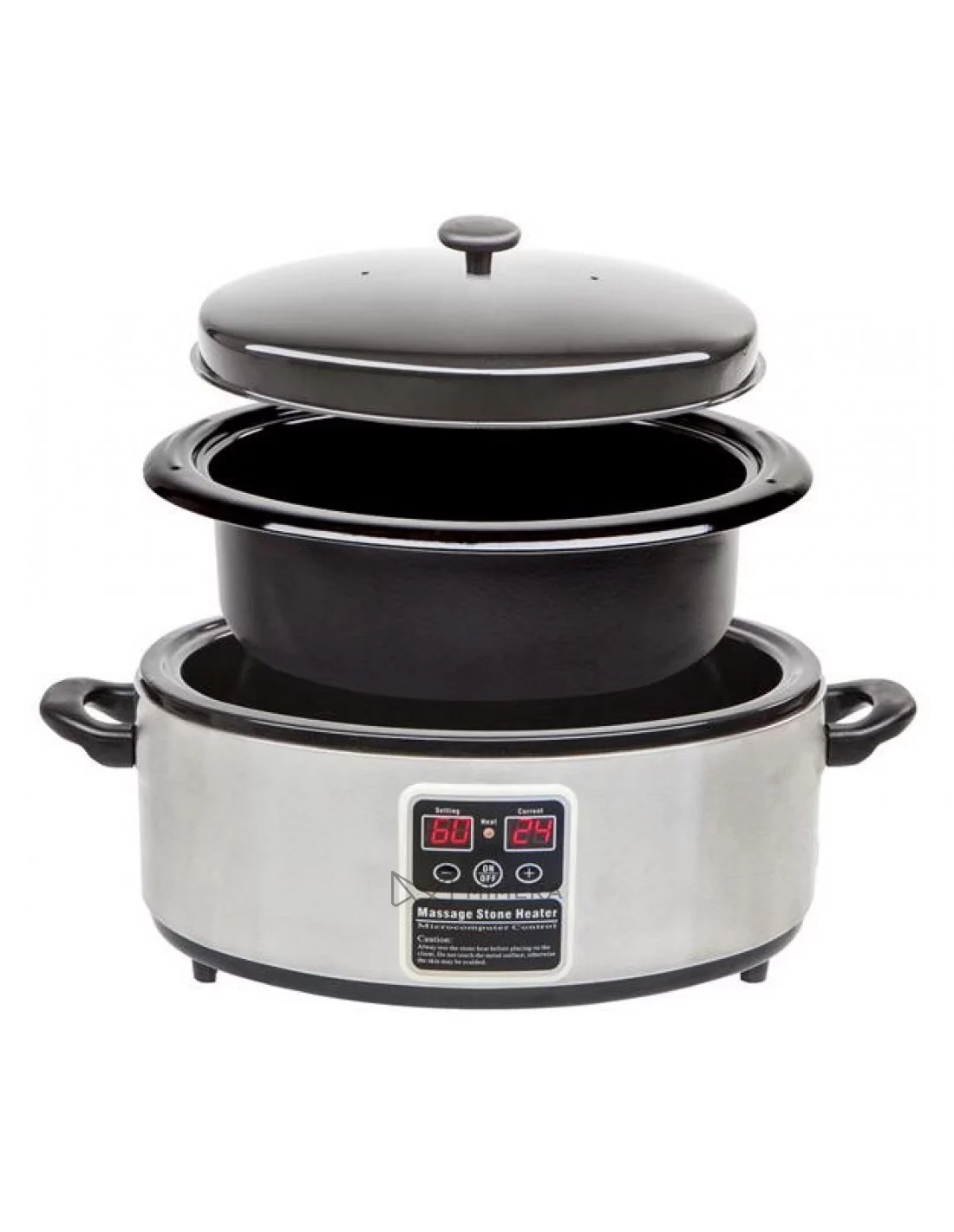 Professioneller Steinwärmer mit digitaler Temperaturregelung, ausgestattet mit Netzkabel, Digitalanzeige und hitzebeständigen Griffen. In das Gerät wir ein waschbarer Behälter gelegt. Auf den Boden des Geräts legen wir ein gefaltetes weißes Handtuch, auf dem wir die Lavasteine verteilen und mit Wasser auffüllen, so dass die Steine unter Wasser sind, jedoch höchstens bis zur MAX gekennzeichneten Linie an der Seite des Behälters. Das Set enthält einen Deckel.