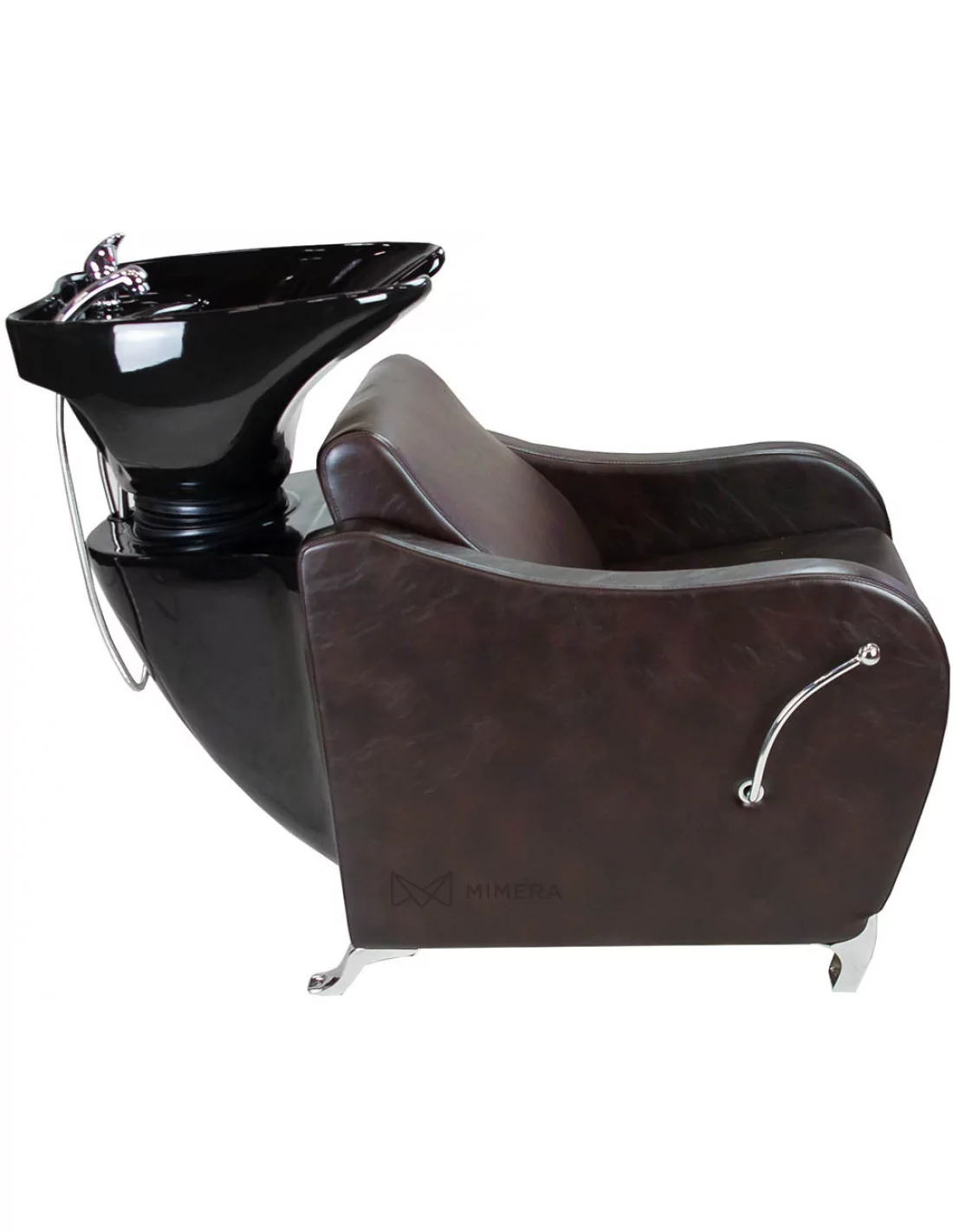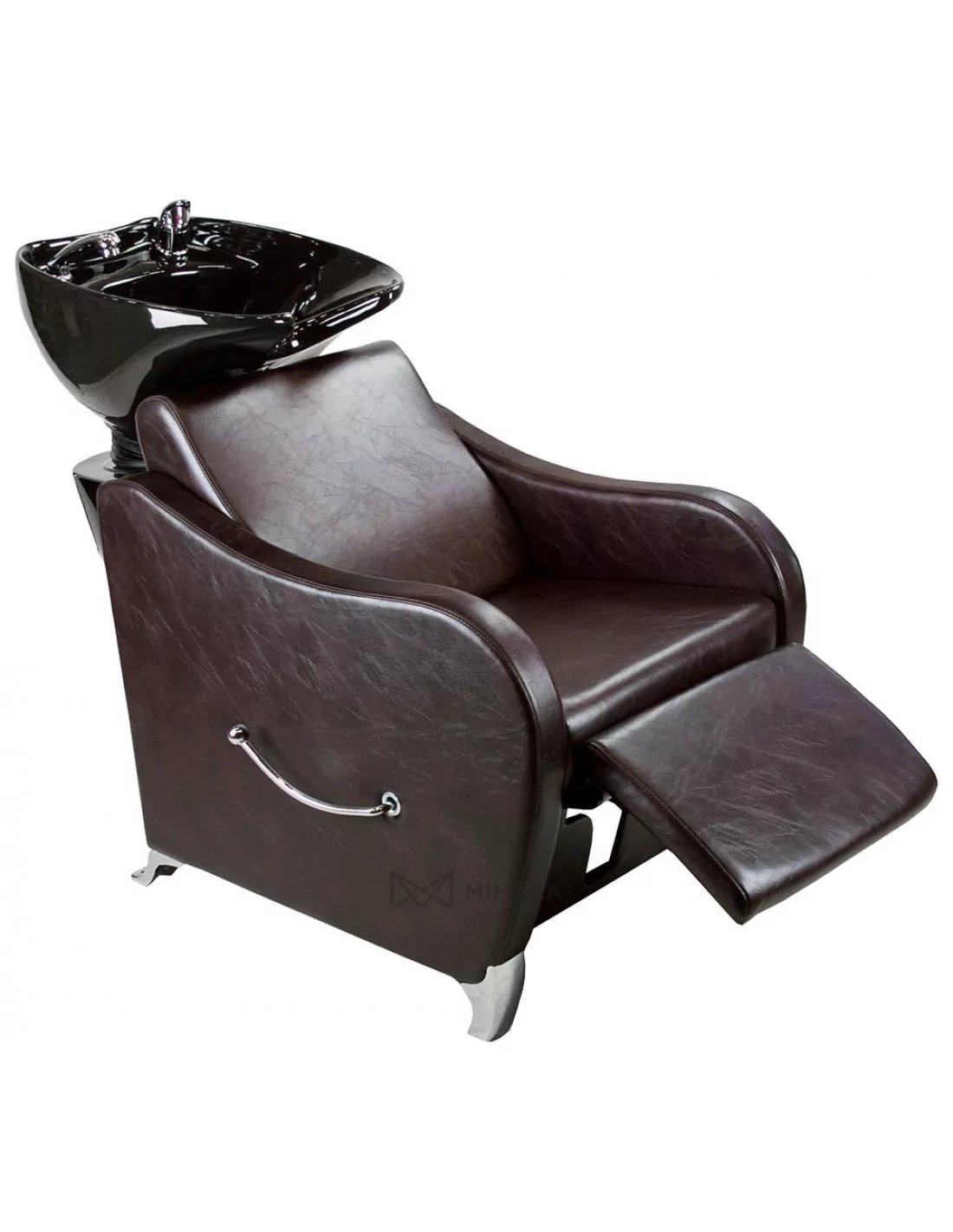 Eine komfortable Wascheinheit in robuster Ausführung mit einem tiefen Keramik-Waschbecken, Metallstuhlbeinen und gepolsterten Armlehnen. Ideal für jeden professionellen Barber oder Friseursalon.