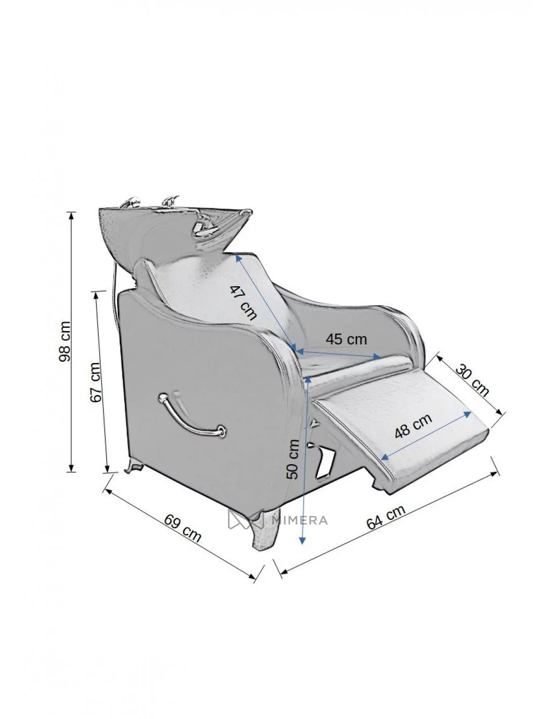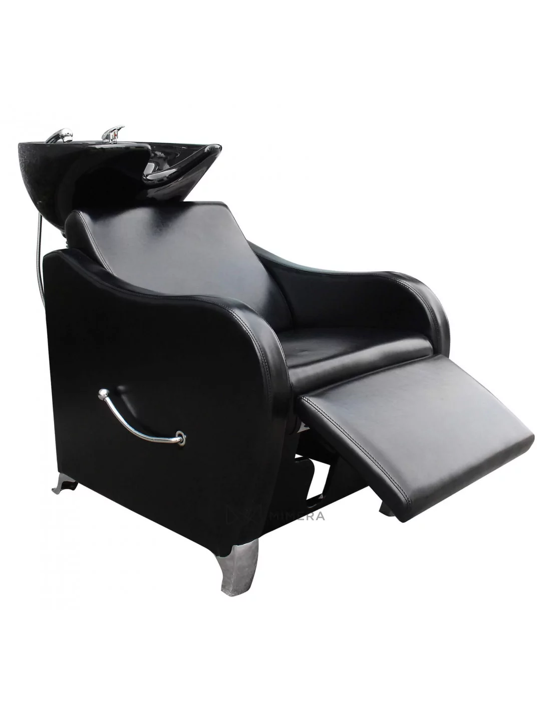 Eine komfortable Wascheinheit in robuster Ausführung mit einem tiefen Keramik-Waschbecken, Metallstuhlbeinen und gepolsterten Armlehnen. Ideal für jeden professionellen Barber oder Friseursalon.