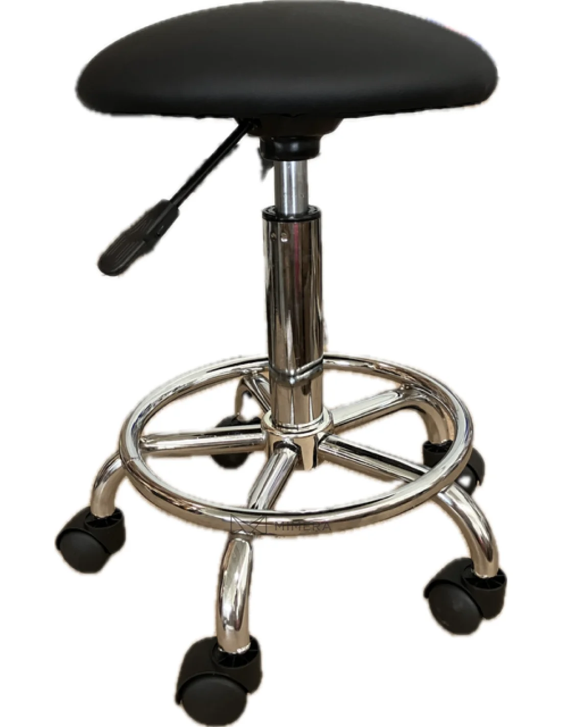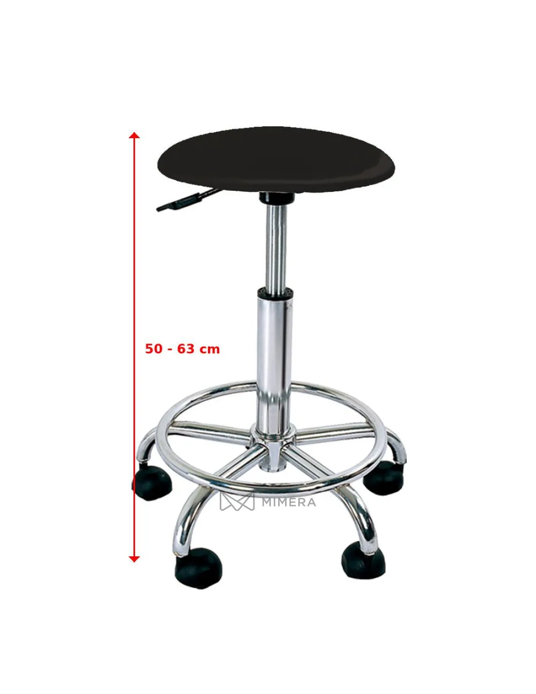 Friseurhocker mit Pilzpolsterung. Die integrierte Ölpumpe ermöglicht es, den Sitz anzuheben und um 360 Grad zu drehen. Der Hocker hat eine sehr strapazierfähige Polsterung und eine robuste, langlebige Konstruktion mit runder Fußstütze.