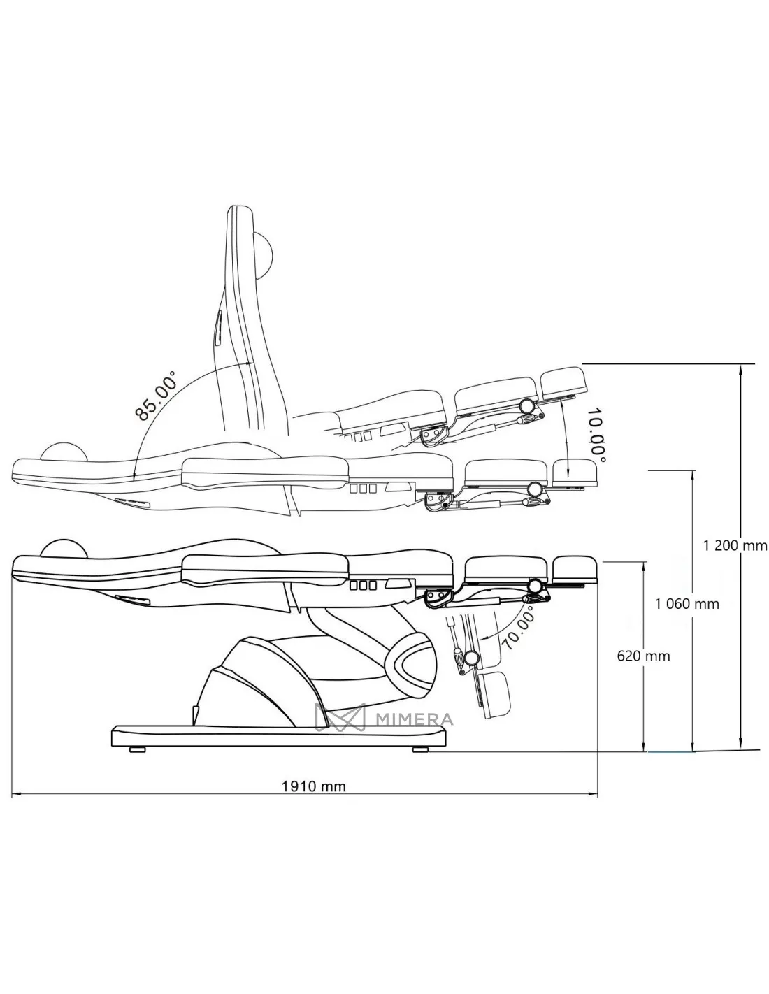 - 3 Motoren zur Höhenverstellung (62-106 cm, bis zu einer Höhe von 120cm in der Wiege), Armlehnen (0 ° + 85 °), Sitzneigung (- 4 ° ~ + 10 °) und Fußstützen (- 70 ° ~ 0 °)