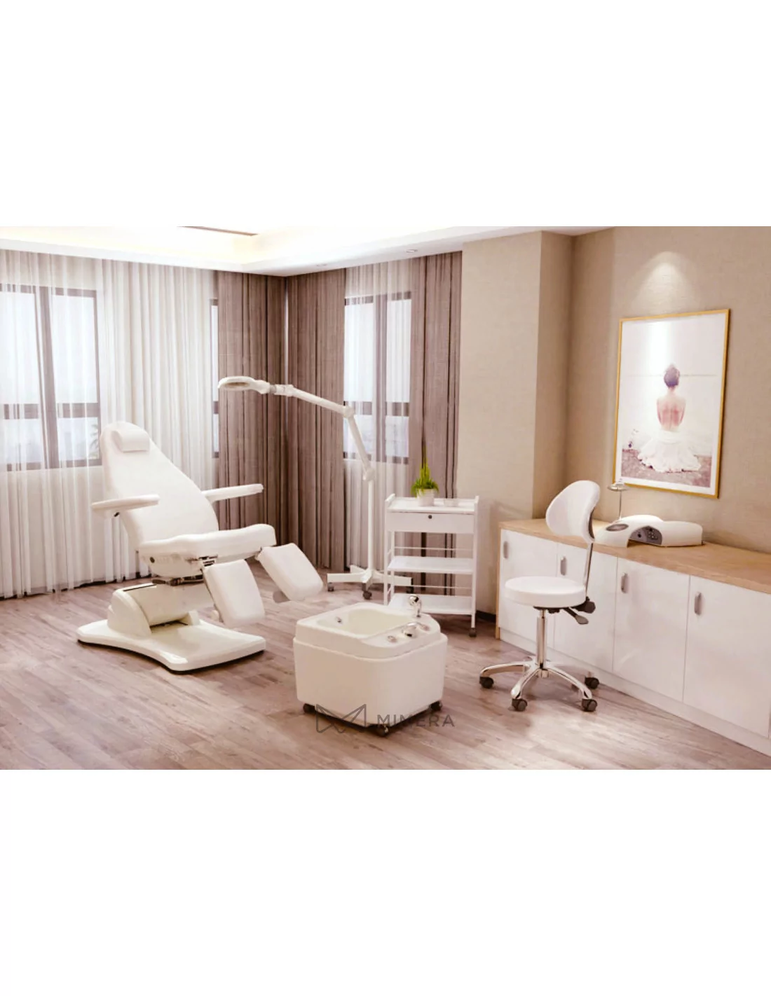 Stilvoller und sehr flexibler Fußpflege-Drehstuhl mit 3 Motoren zum Einstellen von Höhe, Rückenlehne und Sitzneigung, der mit der Handbedienung eingestellt werden kann (im Lieferumfang enthalten). Es ist auch möglich, eine Fußsteuerung zu bestellen. Der Stuhl ist um (- 60°~ +60°) seitlich drehbar. Die Beine sind um 90 ° seitlich schwenkbar, stufenlos per Pneumatikhebel höhenverstellbar und auch ausziehbar.