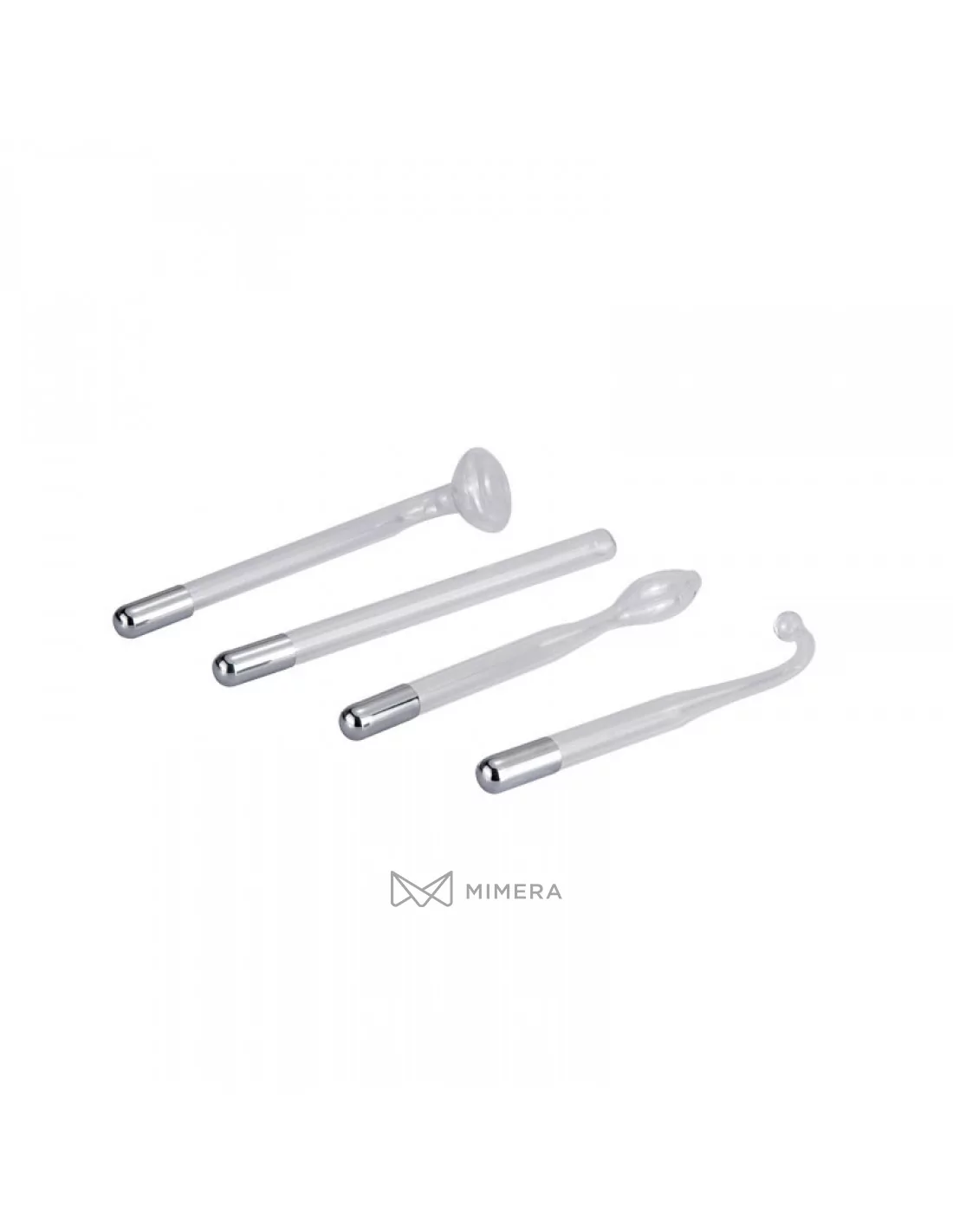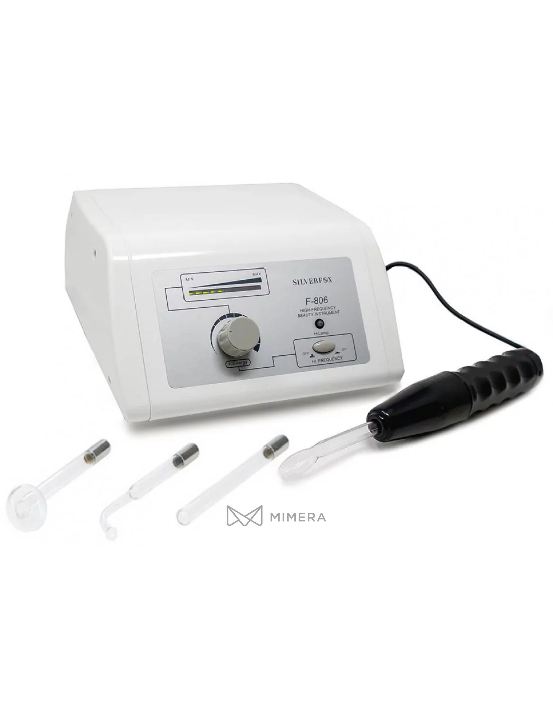 Hochfrequenzgerät F-806 - Ozonisator mit 4 Glaselektroden in Form eines Pilzes, Löffels, Punktes und Stabes zur Behandlung oder Linderung von Akne-Haut. Die Elektroden sind mit Argongas gefüllt, das zu Akne neigende Haut behandelt und ausgezeichnete antibakterielle und heilende Wirkungen hat.