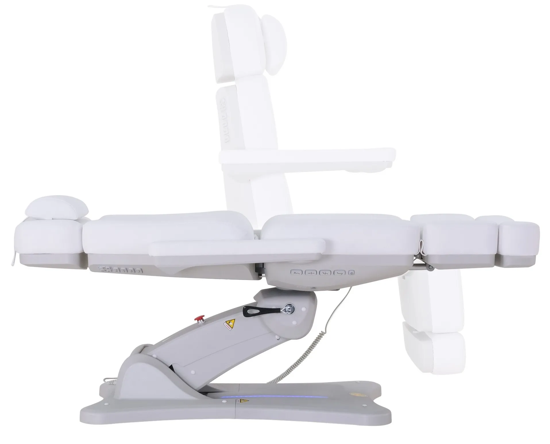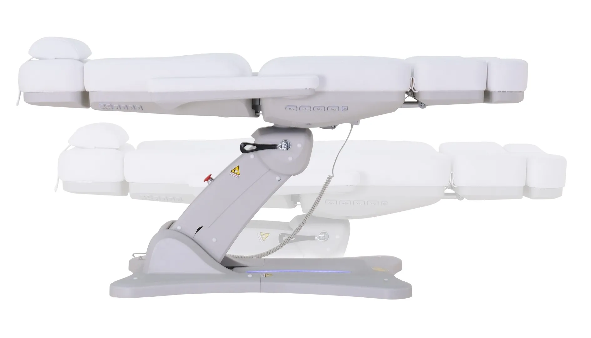 Es ist mit einer komfortablen Polsterung mit integrierter Heizung ausgestattet, die jede Behandlung für die Kunden angenehmer macht. Zur stimmungsvollen Atmosphäre trägt auch die LED-Beleuchtung mit wechselbaren Farben bei, welche die Tasten und das Untergestell der Liege beleuchtet.
