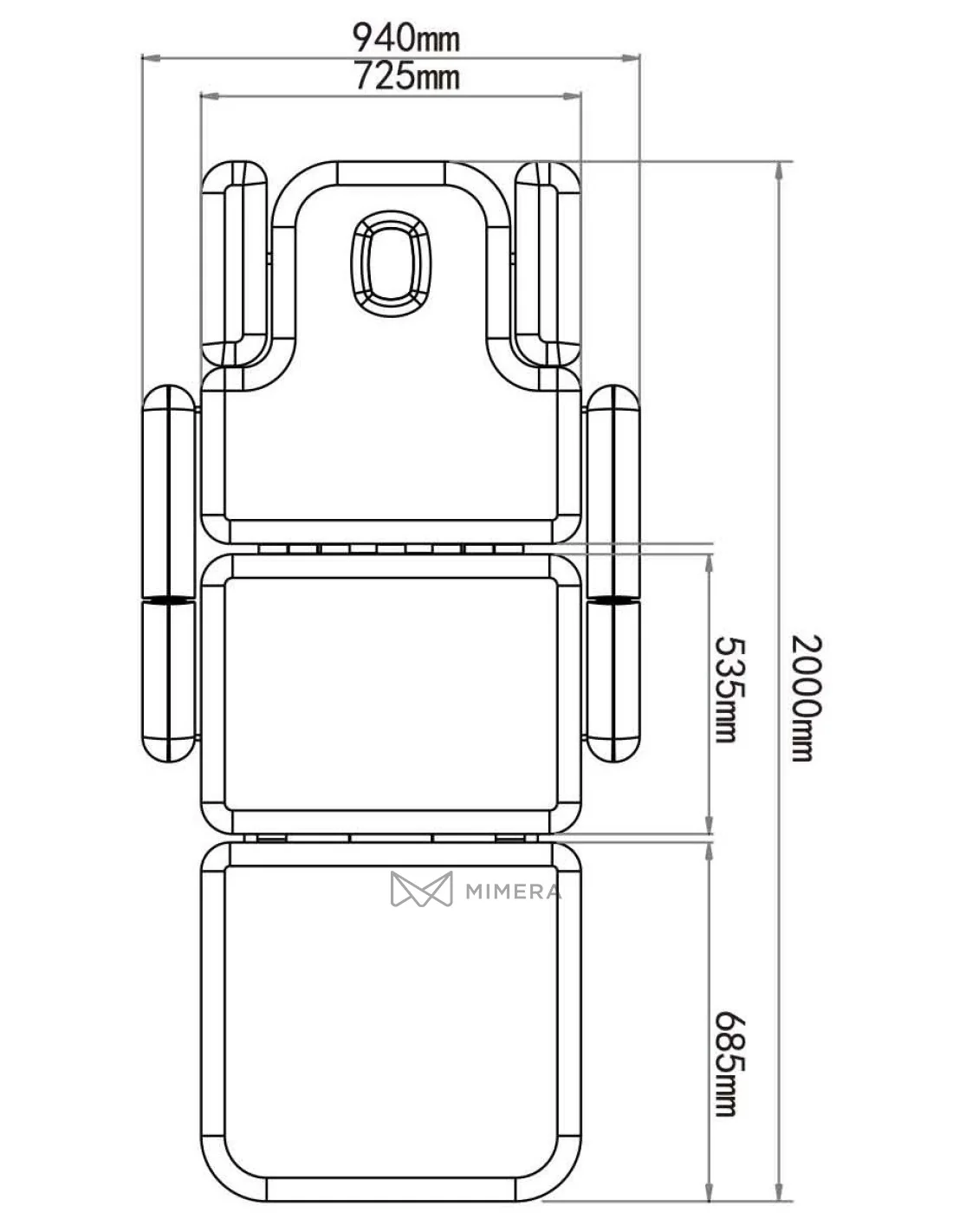 Die Liege verfügt über ein doppeltes Armlehnensystem. Feste 12cm breite Armlehnen sind mit einem pneumatischen Hebel einstellbar. Abnehmbare 11cm breite Armlehnen passen sich flexibel an die Position der Liege an. Die Liege verfügt über eine Gesichtsöffnung, wodurch mehrere Positionen behandelt werden können. Fußkissen für maximalen Komfort.