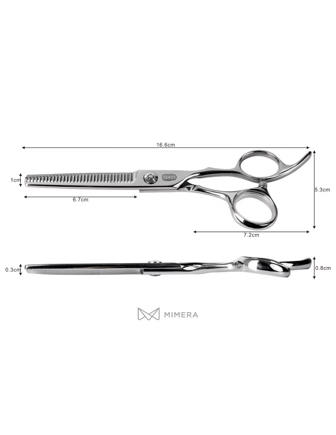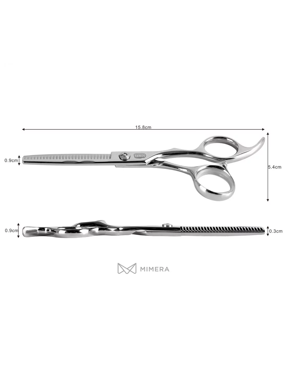 Diese ergonomisch geformte Modellierschere ist ein optimales Werkzeug für den professionellen Friseur. Durch das Schneideblatt lassen sich die Haare einfach ausdünnen.