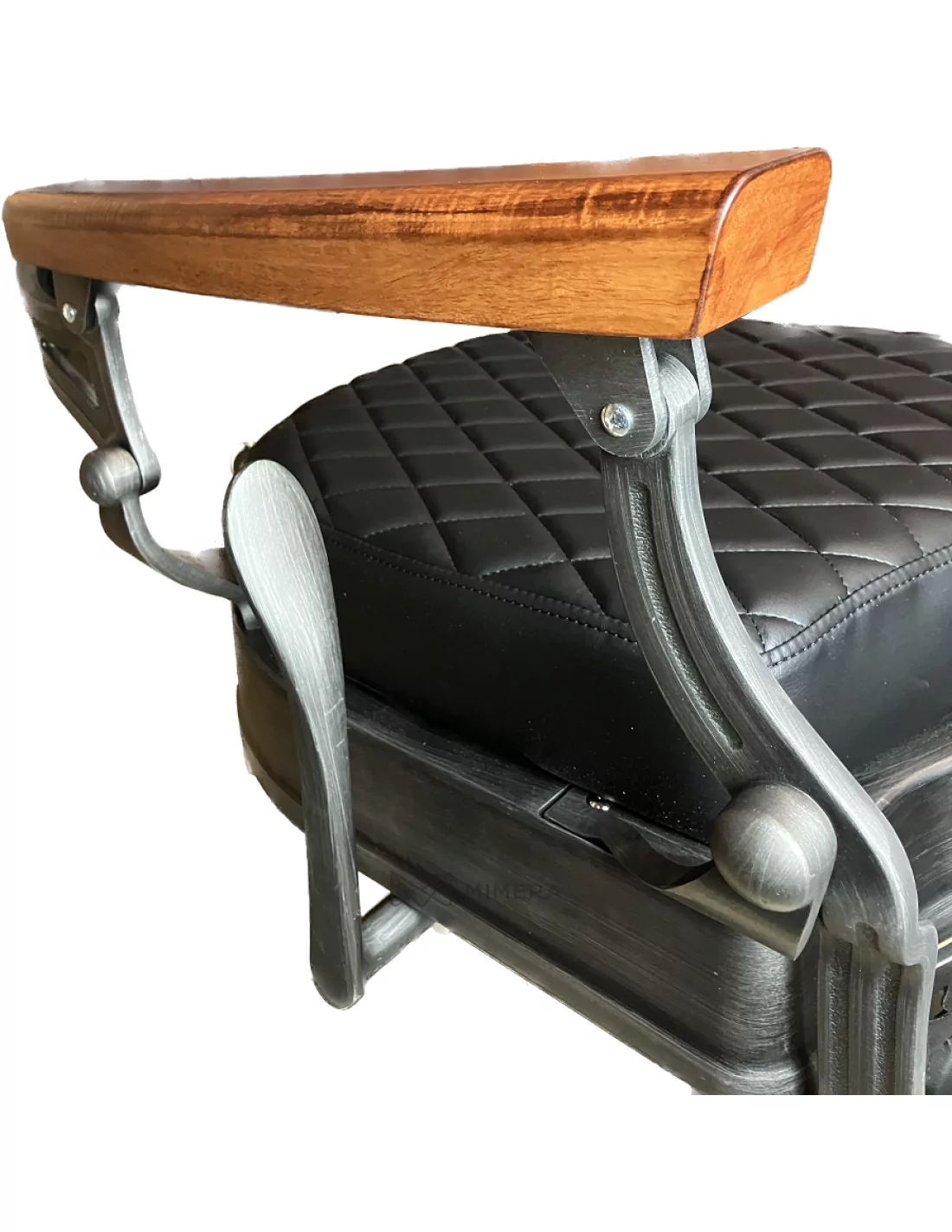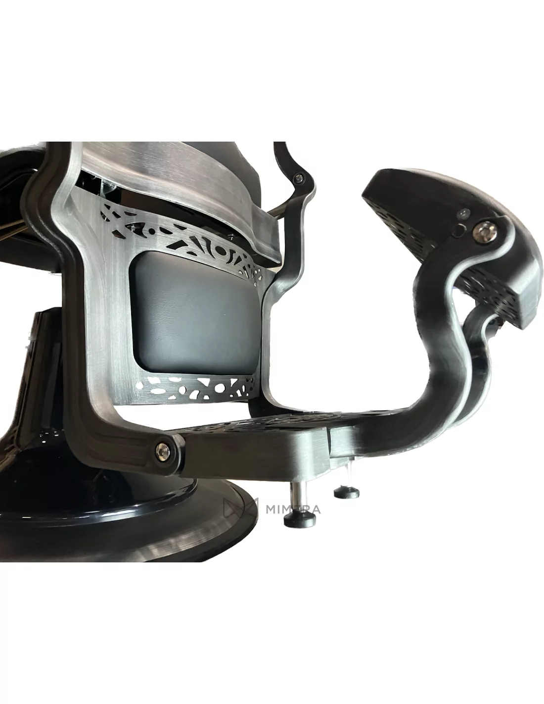 Der Barberstuhl RETRO GREY ist ein echtes Meisterwerk. Sein massiver Edelstahlkörper in schmutzigem Grau mit einer großen massiven Basis ist extrem stabil und gut ausbalanciert.