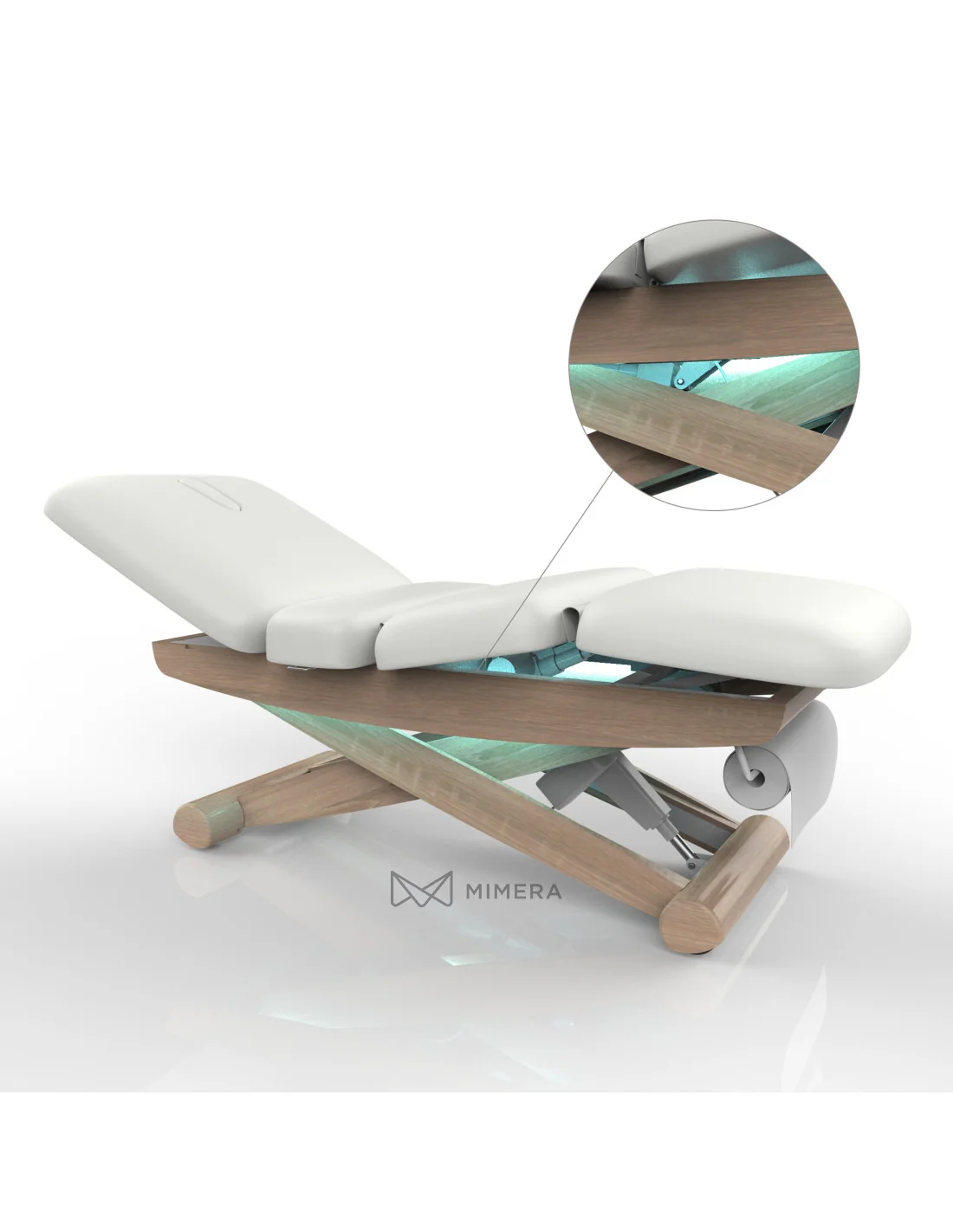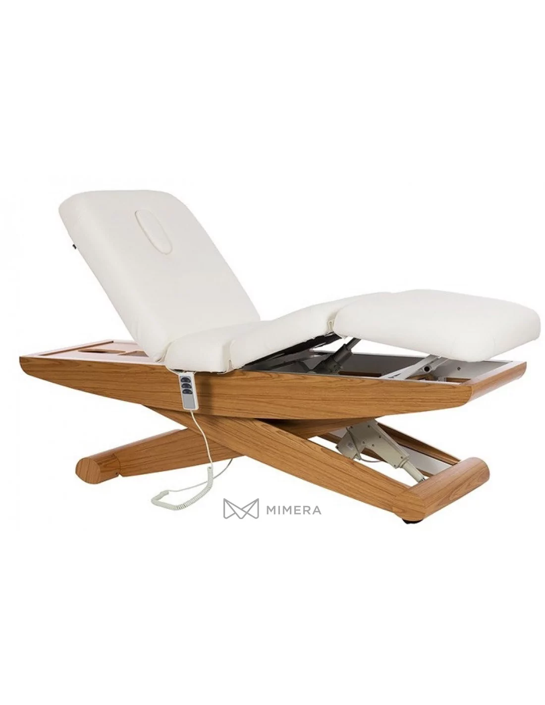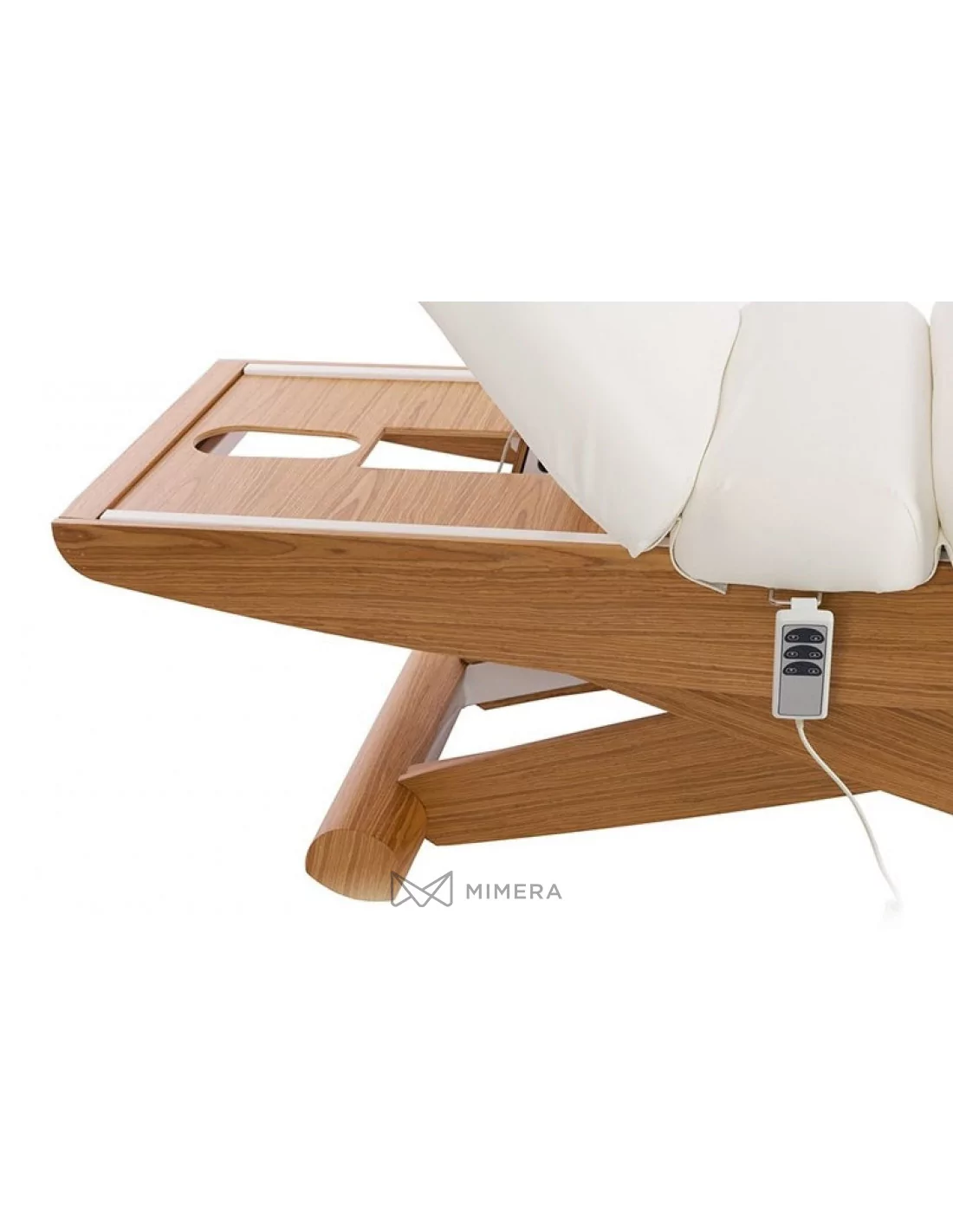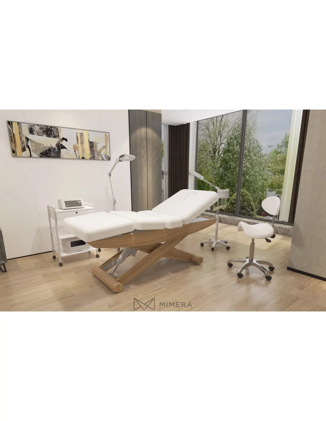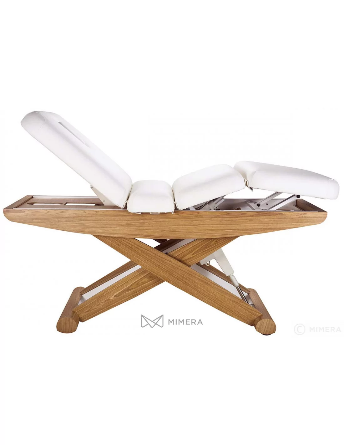 Die Liege hat eine scherenförmige Metallstruktur mit natürlicher Holzveredelung, die dem Raum eine sehr beeindruckende Wirkung verleiht. Die bequeme PU-Polsterung von höchster Qualität ermöglicht eine einfache Pflege und Wartung. Die Liege hat außerdem einen Gesichtsausschnitt.