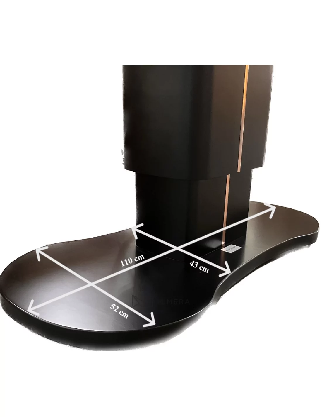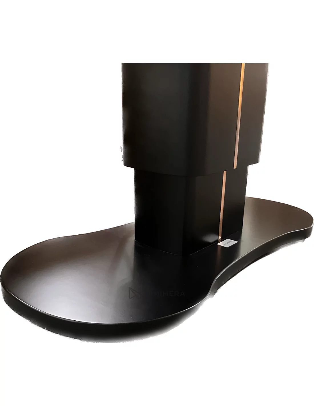 Die Basis der Liege ist äußerst stabil und fest. Es ist aus glattem, mattschwarzem Holz gefertigt, und ein dezenter gold-roter Metallstreifen zieht sich vertikal durch das Gestell.