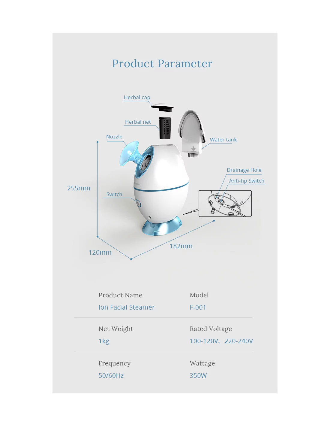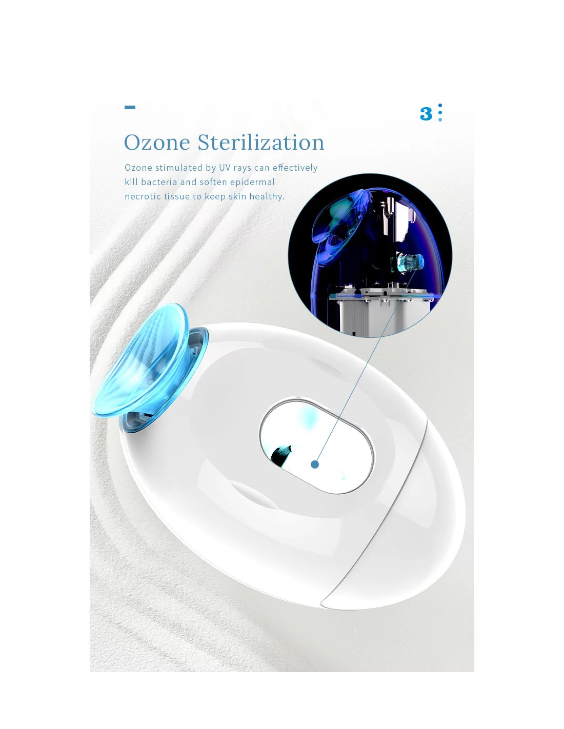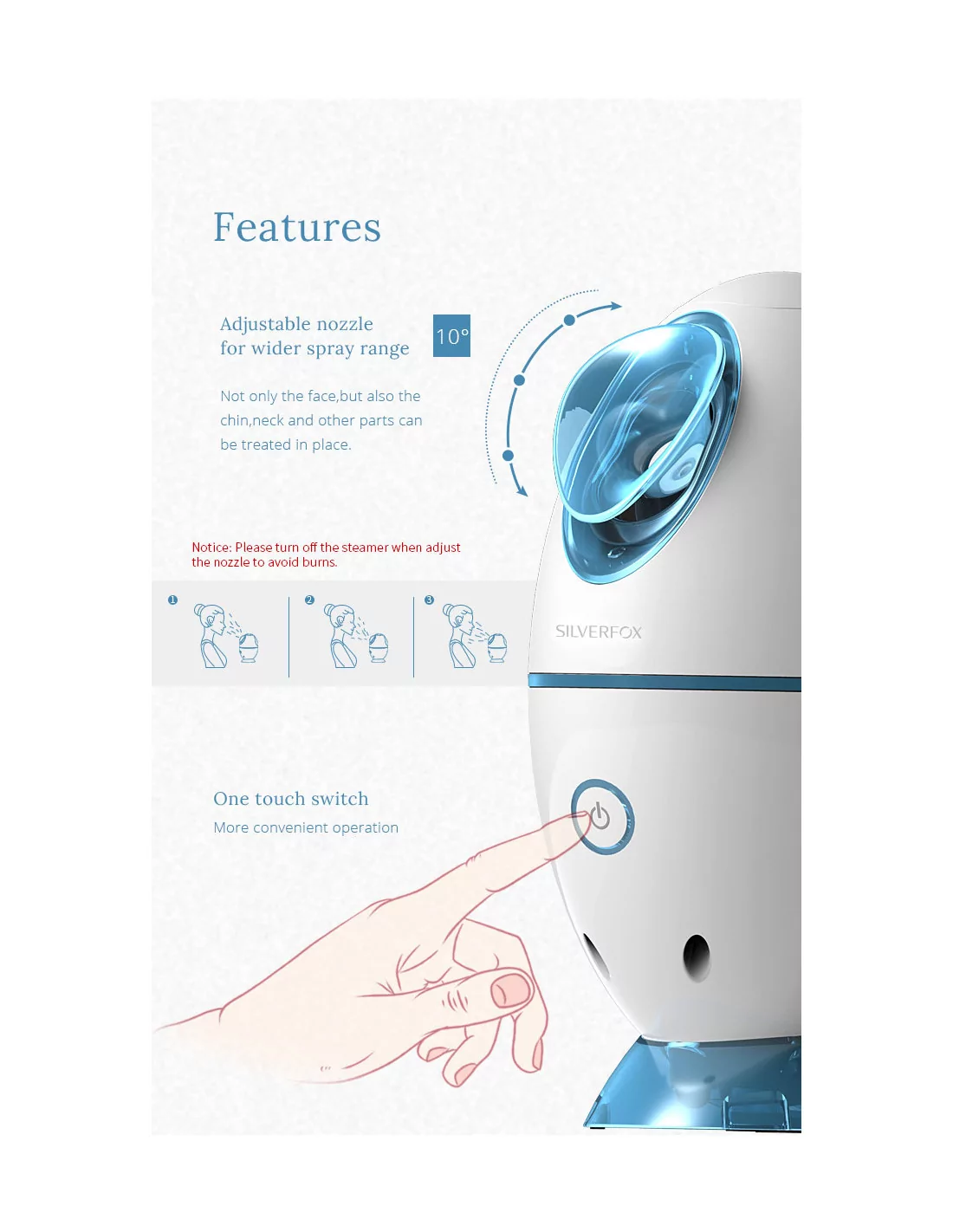 Zusätzlich zu seinem modernen Design bietet dieser Gesichtsbedampfer eine Ozonsterilisation, die durch UV-Licht stimuliert wird, so dass Bakterien effektiv abgetötet und nekrotisches Gewebe der Epidermis aufgeweicht werden kann, um die Haut gesund zu erhalten. Die Verwendung dieses Produkts wird die Blutzirkulation beschleunigen, den Zellstoffwechsel fördern, Falten reduzieren und einen strahlenden und leuchtenden Effekt auf die Haut haben.
