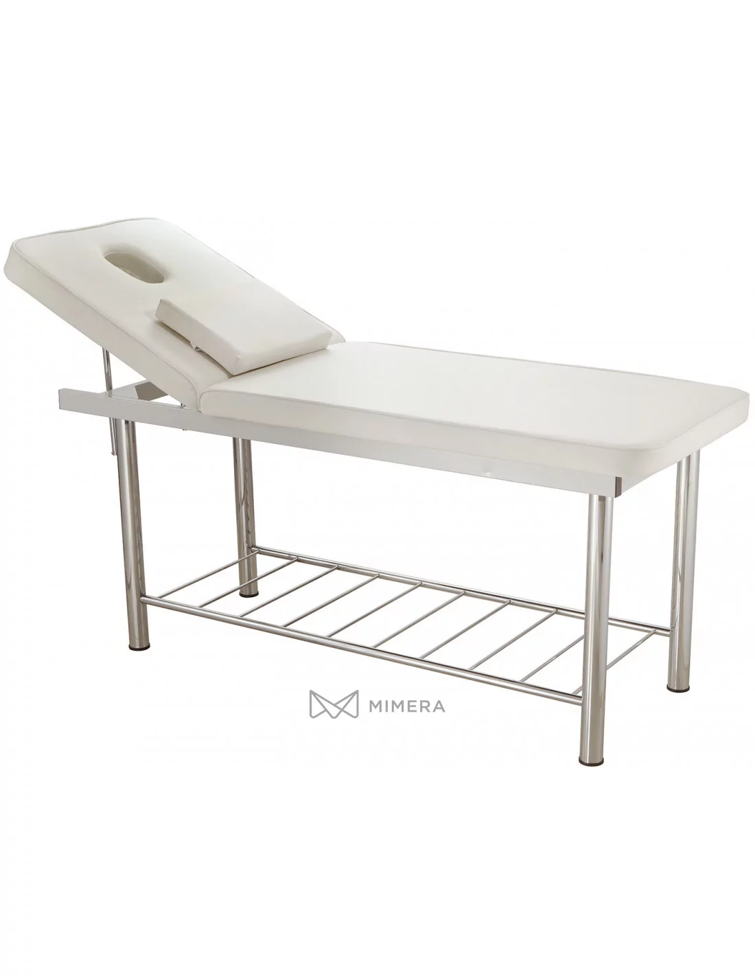Feste Massageliege ALINA mit verchromtem Gestell und verstellbarer Rückenlehne. Sie hat einen Gesichtsausschnitt und ein abnehmbares Kissen. Unter der Liege befindet sich ein großer Ablageplatz für Arbeitsmaterial und Zubehör, das Sie immer griffbereit haben. Die bequeme, hochwertige Polsterung mit einer strapazierfähigen PU-Oberfläche ist leicht zu reinigen.